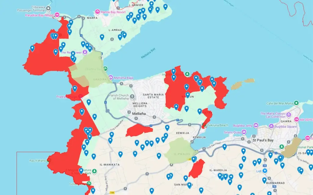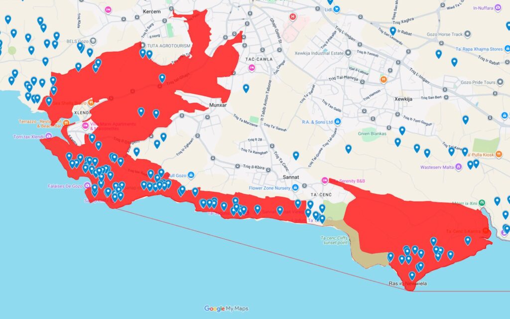 Superimposing the map of 2024’s licensed trapping sites on the map of Natura 2000 sites, which is allowed in Malta, reveals significant overlaps. Trappers can catch birds along the entire protected Southwestern coast of Malta and Southern Gozo. Trapping sites next to bird sanctuaries can also be found. The EU’s court criticised the decision.