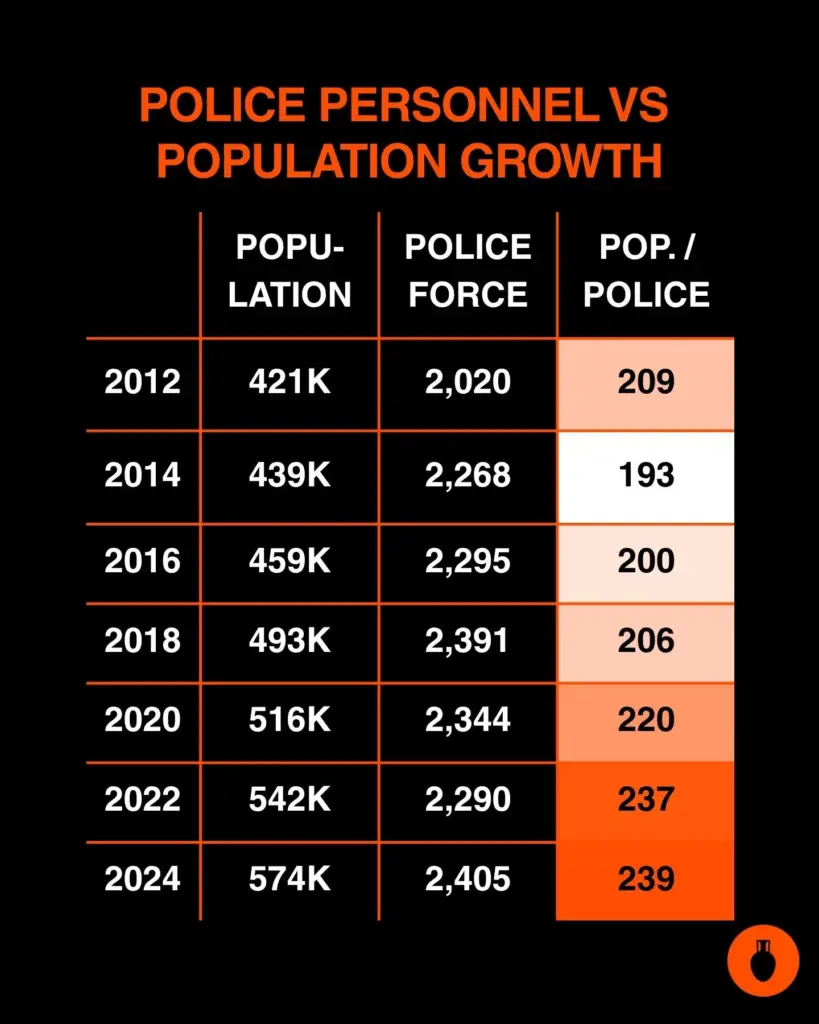 - Police numbers barely grew, up just 32 since 2017 despite sharp population and tourism increases.