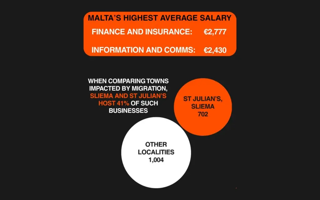 However, Sliema and St Julian’s stood out as outliers, hosting the island’s top-earning private industries. NSO figures show that the two highest-paying sectors are Financial and Insurance Activities (€2,777 per month) and Information and Communication (€2,430 per month).