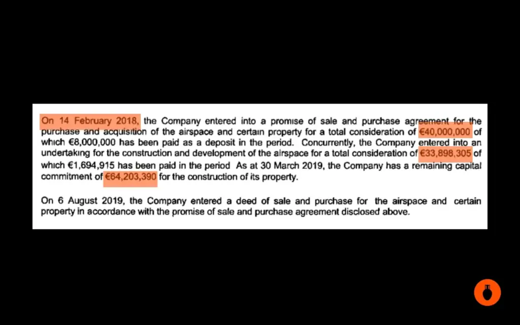 Fortina secured the €40 million promise of sale with Hillside against an €8 million deposit on 14th February 2018, a year and a half before the land restrictions were lifted by Parliament.