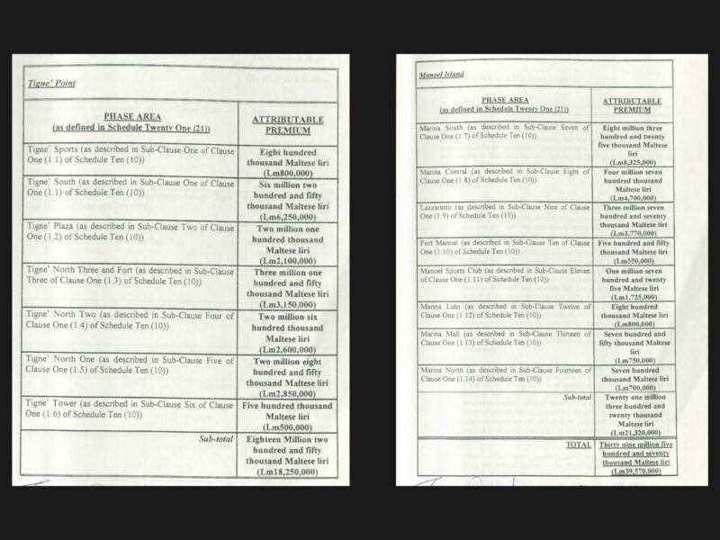 Under the contract, the total value for Manoel Island stood at Lm 21,320,000 (approx. €49 million). However, it should be noted that Lm 15,275,000 (approx. €35 million) of that amount expressly covered the marina and its facilities, which remain operational and seemingly still under MIDI’s control.